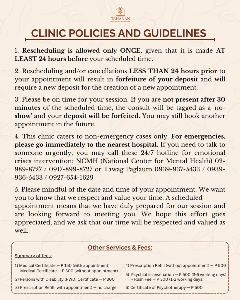 2. Send a photo of your proof of payment to our FB Messenger “Tahanan Mental Health and Wellness Clinic” along with the following: